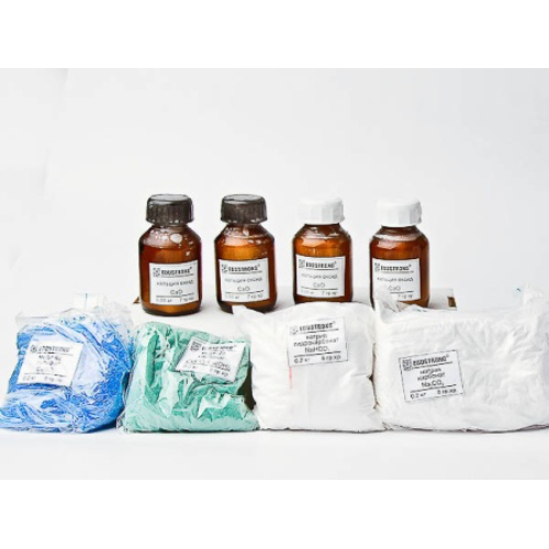 Состав набора (кг): Кальция окись «ч» — 0,2. Медь (II) сернокислая безводная «ч» — 0,2. Медь (II) углекислая основная «ч» — 0,2. Натрий углекислый «ч» — 0,2. Натрий углекислый кислый «ч» — 0,2.