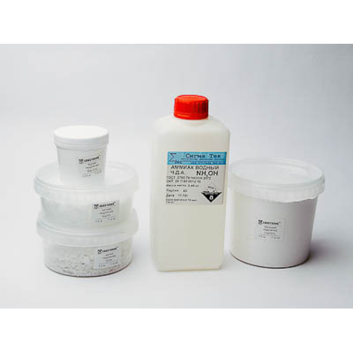 Состав набора (кг): Аммиак водный 25% — 0,45. Бария гидроксид — 0,05. Калия гидроксид — 0,2. Кальция гидроксид — 0,5. Натрия гидроксид — 0,5.
