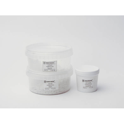 Состав набора (кг): Гидроокись калия «ч» — 0,25. Гидроокись натрия «ч» — 0,2. Гидроокись кальция «ч» — 0,05.