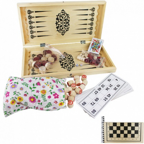 Комплектация: 24 шашки (12 черных и 12 белых), игровые кубики, колода карт, мешочек, бочонки, карточки для лото, игровое поле, правила Материал: пластик, картон Упаковка: картонная коробка с дисплеем Размер упаковки: 40*21*3,5 см Возраст: 6+ Количество предполагаемых игроков: 2 Страна обладатель бренда: Россия Занимательная настольная игра 4 в 1 обязательно понравится как детям, так и взрослым. Это отличный подарок, который заинтересует Вашего ребёнка. Настольная игра отличается оригинальным внешним видом и изготовлено из качественной древесины. В «Шашки» любят поиграть как дети, так и взрослые. Правила игры просты и интуитивно понятны. Кроме того, фигурками из набора игры можно играть и в нетрадиционные игры — поддавки, уголки или в «Чапаева». Шашки развивают стратегическое и логическое мышление. Шашки — это игра для двух игроков, заключающаяся в передвижении определённым образом фишек-шашек по клеткам шашечной доски. Во время партии каждому игроку принадлежат шашки одного цвета. Цель игры — взять все шашки соперника или лишить их возможности хода (запереть). Цель игры «Нарды» — бросая кости и передвигая шашки в соответствии с выпавшими очками, пройти шашками полный круг по доске, зайти ими в свой дом и выбросить их за доску раньше, чем это сделает противник. Есть две основные разновидности — длинные и короткие нарды. Та кже в наборе есть старое доброе лото и колода инральных карт.