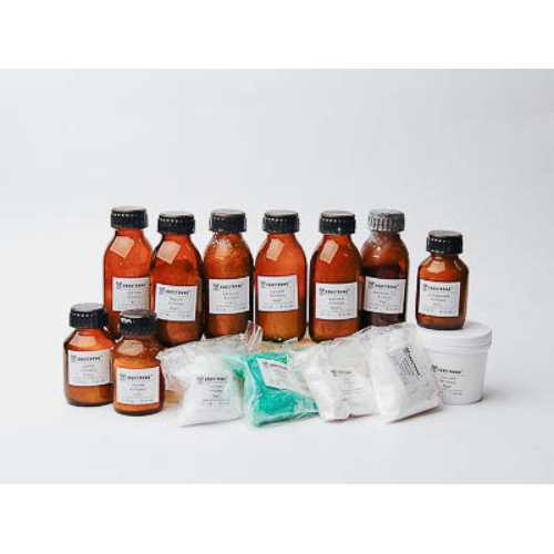 Состав набора (кг): Алюминия хлорид — 0,05. Аммония хлорид — 0,1. Железа (III) хлорид — 0,1. Калия йодид — 0,1. Калия хлорид — 0,05. Цинка хлорид — 0,05. Кальция хлорид — 0,1. Магния хлорид — 0,1. Натрия хлорид — 0,1. Меди (II) хлорид — 0,1. Бария хлорид — 0,1. Натрия бромид — 0,1. Натрия фторид — 0,05. Лития хлорид — 0,05.