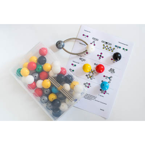 Набор предназначен для составления моделей молекул различных веществ при изучении курса неорганической и органической химии. Шары представляют собой модели атомов различных химических элементов. В шарах имеются отверстия для крепления стержней. Для удобства работы с набором модели атомов каждого элемента окрашены в свой цвет (можно использовать один и тот же цвет для различных атомов в разных молекулах). Стержни предназначены для моделирования разных видов связей. Короткие стержни используются для моделирования одинарных связей, гибкие длинные стержни – для моделирования двойных, тройных и одинарных с измененным углом (например, в органических соединениях) связей. Габаритные размеры в упаковке: 235х175х20 мм. Вес: не более 0,31 кг. Комплектность: шары различных цветов – 43 шт. стержни длиной 50 мм – 20 шт. стержни длиной 80 мм гибкие – 10 шт. цветной вкладыш с решениями заданий – 1 шт. руководство по эксплуатации – 1 шт.