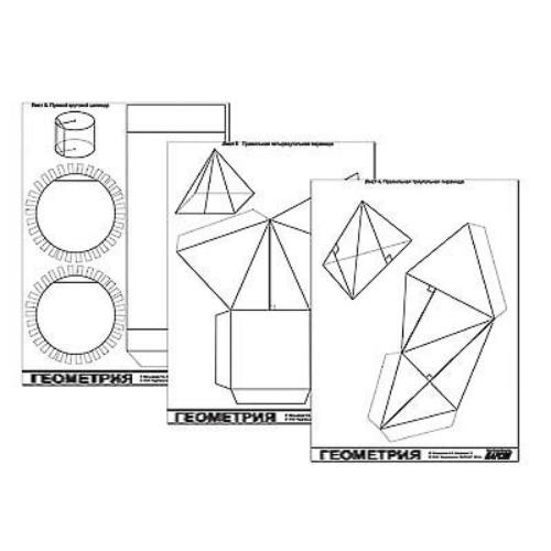Пособие предназначено для проведения лабораторных работ по геометрии. Габаритные размеры в упаковке (дл.*шир.*выс.), см: 30,5*22*3. Вес, кг, не более 0,2. Комплектность: листы с развертками пространственных фигур – 11 шт., руководство по эксплуатации – 1 шт. Модели выполнены в виде разверток, которые собираются в пространственные фигуры. Каждая фигура представлена в «полном» виде и в «разрезанном» на две части секущей плоскостью. На поверхности фигур изображены некоторые необходимые для вычислений элементы. К каждой фигуре даны наборы заданий.