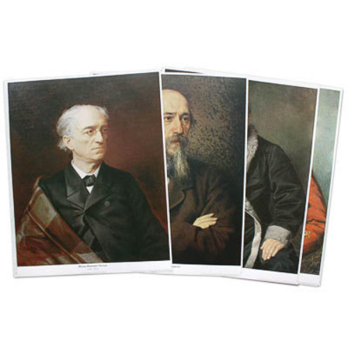 Комплектность: 16 репродукций (размером 40х50 см, плотность бумаги 230-250 г), упаковочная папка. Пособие представляет собой набор репродукций портретов русских писателей XIX века, выполненных русскими художниками, изготовленных на плотной небликующей бумаге. В состав набора включены портреты А.Н. Островского, Н.А. Некрасова, В.А. Жуковского, А.И. Герцена, И.С. Тургенева, А.С. Пушкина, А.П. Чехова, И.А. Крылова, Л.Н. Толстого, М.Е. Салтыков-Щедрина, А.С. Грибоедова, Ф.М. Достоевского, Н.В. Гоголя, А.А. Фета, Ф.И. Тютчева, М.Ю. Лермонтова.