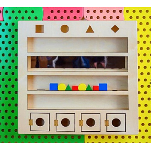С помощью данного настенного модуля ребенок учится вкладывать объёмные геометрические фигуры: цилиндр, куб, треугольную и прямоугольную призму в соответствующие отверстия в различных направления: сверху вниз, сверху вниз с зеркальным контролем и от себя. В нижнем ряду требуется не только вложить фигурки, но и открыть дверцу, чтобы достать их. Работа с модулем способствует развитию сенсомоторики, координации движений глаз-рука, стереогностического восприятия, подготавливает ребенка к восприятию формы и проекции формы (с помощью зеркала). Настенный модуль, выполненный из фанеры. Размер изделия: Высота: 700 мм. Ширина: 700 мм. Толщина: 72 мм. Вес — 6 кг. Объем — 0,05 м3.