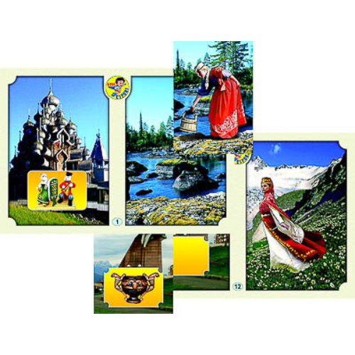 ​Настольно-печатная игра предназначена для организации игровой и познавательно-исследовательской деятельности детей в детском саду и дома. Может использоваться в качестве игрового и наглядного материала в следующих образовательных областях: речевое развитие, познавательное развитие, социально-коммуникативное развитие, а также во время логопедических занятий. Также может использоваться в начальной школе. Габаритные размеры в упаковке (дл.*шир.*выс.), см: 22*16*3. Вес, кг, не более 0,3. Комплектность: игровое поле — 12 шт., карточки — 24 шт., руководство по эксплуатации — 1 шт. Игра состоит из 12-ти полноцветных игровых полей формата А5 и 24-х полноцветных карточек. Карточки и игровые поля изготовлены из картона и ламинированы пленкой. Каждое игровое поле посвящено одному региону России. На карточках изображены женщины в национальных костюмах и памятники архитектуры, характерные для определенного этноса России; они служат продолжением изображений на игровых полях и содержат общие с ним детали фона. На карточках с изображением зданий (сооружений) дана врезка, на которой представлены предметы декоративно-прикладного искусства, являющиеся визитной карточкой данного народа.