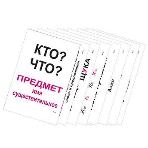 Комплектность: 1. Знаки препинания в конце предложения. 2. “ЖИ”-“ШИ”, “ЧА”-“ЩА”, “ЧУ-ЩУ”. 3. Перенос слова. 4. Безударные гласные. 5. Парные согласные. 6. Фонетический разбор слова. 7. Слова, обозначающие признак. 8. Слова, обозначающие предмет. 9. Слова, обозначающие действие. 10. Члены предложения. 11. Алфавит.