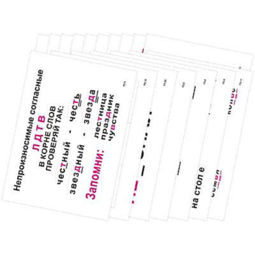 Комплектность: 1. Разбор предложения по членам предложения. 2. Порядок разбора состава слова. 3. Однокоренные слова, форма слова. 4. Состав слова. 5. Непроизносимые согласные. 6. Сочетание “СН” без “Т”. 7. Правописание приставки. 8. Правописание предлога. 9. Суффиксы. 10. Сочетание “ЧК”, “ЧН”. 11. Разделительный “Ъ”. 12. Род имени существительных. 13. Число имен существительных. 14. Мягкий знак у существительных после шипящих. 15. Род имени прилагательных. 16. Число имен прилагательных. 17. Безударные окончания имен прилагательных. 18. Неопределенная форма глагола. 19. Время глагола. 20. “НЕ” с глаголами. 21. Сводная таблица правил корня. 22. Части речи.