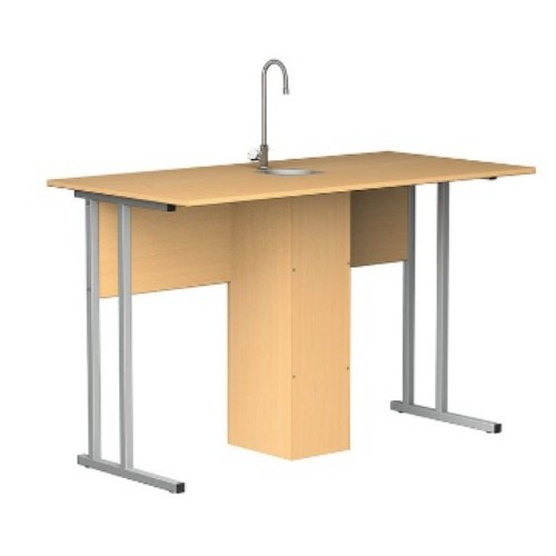 Парта стол лабораторный для кабинета химии, с сантехникой, ученический.Производимые лабораторные столы (парты) для кабинета химии можно купить фиксированной высоты на 5,6,7 ростовую группу*. Размеры столешницы 2-местного ученического лабораторного стола (ширина/глубина) — 1200х500 мм.Каркас – сварной, из металлической трубы квадратного сечения 25х25 мм, с толщиной стенки 1,5 мм. Покрашен полимерно-порошковой краской, цвет (базовый) – светло-серый. Все торцы каркаса закрыты пластиковыми заглушками, ножки снабжены пластиковыми подпятниками. Высота каркаса соответствует выбранной ростовой группе. Столешница двухместной ученической лабораторной парты-стола изготовлена из ЛДСП, цвет – «Светлый бук», толщиной 16 мм, с кромкой из ПВХ, с покрытием рабочей поверхности водо- термостойким пластиком. Стол лабораторный для кабинета химии оснащен сантехникой (сливной пластиковой раковиной и водопроводным краном). Канализационные и водопроводные коммуникации (снизу столешницы) закрыты защитным коробом.