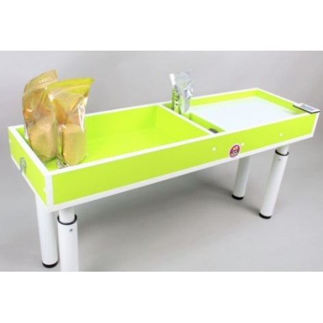 Особенности песочницы. Песочная терапия – это направление, толчок к развитию которого дали сами дети. Сегодня этот метод широко известен и применяется наравне с такими методиками как сказкотерапия, музыкотерапия, рисования и другие. Песочница – это та среда, в которой дети развивают свои способности, это один из основных способов познания окружающего мира. Специалисты утверждают, что песок способен поглощать негативную энергию, очищать энергетику человека, стабилизировать эмоциональное состояние. Все знают, как дети любят играть с песком. Он притягивает их как магнит. Ребенок еще не успевает осознать, что он делает, как его руки уже вовсю пересыпают песок, строят горы, тоннели, вначале создают, затем разрушают, чертят линии и разнообразные узоры, зарываются в него руками. А если у ребенка найдутся фигурки и здания, то в песочнице уже разыгрывается целый мир с городами и морями, ребенок полностью погружается в эту игру. Описание: — Общий размер: 1400*500*100 мм; — Материал — ЛДСП (цвета — лайм, небесно-голубой, белый на выбор); — Крышка с креплением (в комплекте) — может использоваться как столешница; — Опоры телескопические (4 шт); — Поле для работы с песком — 700*500 мм; — Поле с подсветкой — 700*500 мм; — Отсек для хранения песка; — Песок в комплекте 7 кг.