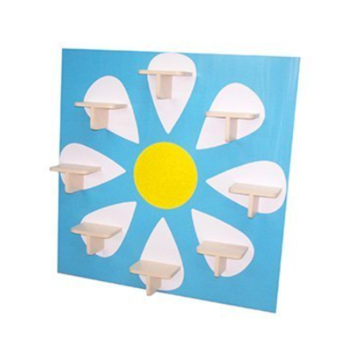 Размер: 110*110*23 см. Материал: ЛДСП. Описание: Цвет панели голубой, лепестки из клеевой пленки белого цвета, на каждом лепестке полочка на консоли белого цвета, общее количество лепестков — 8. В центре — желтый круг из клеевой пленки. Данные для транспортировки: объем 0,06 м3., вес 33 кг.