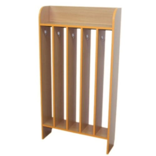 Размер: 70*20*130 см. Материал: ЛДСП. Описание: Задняя стенка, основные элементы бук или кремовые, кромка цветная. В верхней части стеллажа расположена небольшая открытая полочка, ниже: стеллаж разделен на пять вертикальных отделений, в каждом отделении к боковой стенке прикреплены два крючка для полотенец. Задняя стенка – ламинированное ДВП. Данные для транспортировки: объем 0,03 м3., вес 16 кг.