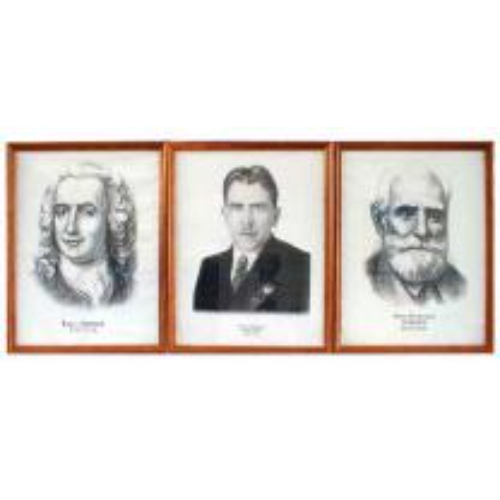 Предназначены для постоянного экспонирования как элемент оформления кабинета. Представляют собой комплект портретов формата А3, выполненных на качественной белой бумаге, в деревянной раме под стеклом. На портретах указаны фамилии (с именами, либо с именами и отчествами) и даты жизни ученых. При подготовке портретов были использованы наиболее известные изображения ученых. Стоимость указана за один портрет.
