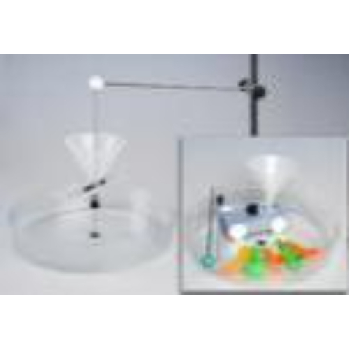Прибор предназначен для демонстрации реактивного движения. Габаритные размеры в упаковке (дл.*шир.*выс.), см: 30,0*30,0*12,0. Вес, кг, не более 0,45. В комплект входят: конусообразный сосуд – 1 шт., стеклянные трубки – 2 шт., спица-острие – 1 шт., пробка резиновая с отверстием – 2 шт., держатель для спицы с шариком на конце – 1 шт., тележка с трубкой – 1 шт., шарики воздушные – 5 шт., подставка пластиковая для сбора воды – 1 шт., руководство по эксплуатации – 1 шт. Одна пробка насажена на спицу, вторая вставлена в тележку. Дно конусообразного сосуда снабжено двумя боковыми отверстиями для изогнутых под прямым углом стеклянных трубок и отверстием под резиновую пробку. Шарик на конце держателя для спицы снабжен отверстием для свободного вращения в нем спицы-острия. Пробка надета на спицу-острие. Для проведения демонстрации необходим штатив с муфтой, сосуд с водой и насос. Сохран
