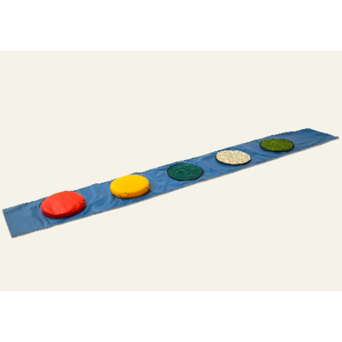 Сенсорная тропа — это дорожка, на которую с помощью липучек крепятся 5 мешочков из прочной ткани с разными наполнителями. Диаметр круга: 30 см. Ходьба по «кочкам» — мешочкам полезна для развития тактильного восприятия, координации и профилактики плоскостопия. Рекомендуется ходить по дорожке босиком или в тонких носках. Все съёмные элементы легко моются. Размер изделия: 2000х350 мм. Вес — 1,8 кг. Объем — 0,32 м3.