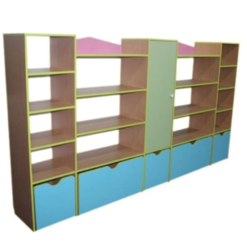 Материал: ЛДСП 16 мм., МДФ, кромка 0,4 и 2 мм. Размер: 280*40*150 см. Описание: Шкаф стенка для игрушек представляет собой три узких стеллажа, шириной 41 см., соединенных между собой четырьмя полками, шириной 77 см. Основной цвет бук или кремовый. Фасады цветные по желанию заказчика. Крайние стеллажи открытые с четырьмя полками высота каждой 25 см., снизу выкатной ящик, размером 36*38 см. Средний узкий стеллаж с глухой дверкой на все четыре полки, снизу так же выкатной ящик. Под соединительные полки устанавливаются выкатные ящики, размером 76*38 см. Стеллажи и соединительные полки имеют заднюю стенку из МДФ. Верхние соединительные полки со стороны стены имеют бортик из цветного ЛДСП в форме треугольника. Для сохранности покрытия пола стеллажи устанавливаются на пластиковые подпятники. Данные для транспортировки: объем 0,41 м3., вес 235 кг.