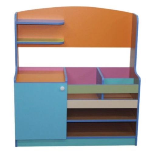 Материал: ЛДСП. Размер: 100*40*110 см. Описание: Основной цвет бук или кремовый. Цвет по желанию заказчика. Стеллаж, нижняя часть которого разделена на две части: первая левая часть — тумба с дверкой, внутри с двумя полками, сверху справа с небольшим бортиком из ЛДСП. Вторая часть — внизу открытая полка, над ней еще одна полка, которая является дном ящика для мячей, который с фасада ограничен двумя цветными планками, со стороны стены панелью из ЛДСП. Ящик разделен на 2 части вертикальной перегородкой до середины, справа, с пощью планок образуется небольшой короб для мелочей. Верх стеллажа фигурной формы с двумя открытыми полками слева. Данные для транспортировки: объем 0,086 м3., вес 64 кг., 1 место.