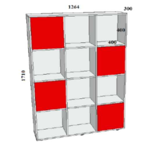 Стеллаж 1264*300*1710 мм. Топ — ЛДСП 22/2 мм, детали — ЛДСП 16/0,4 мм. Цвет каркаса: Белый, цвет фасадов: Красный