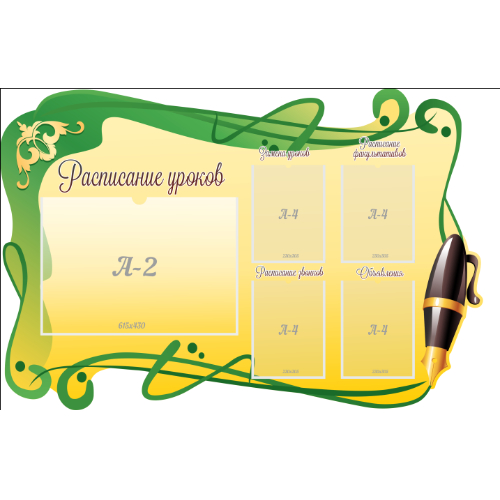 Размеры: 1,5х1 м. Количество деталей: 1 Материал: пластик ПВХ 3мм Рисунок: пленка с фотопечатью 720 dpi, ламинирующая пленка Разделы: Расписание уроков Количество карманов: 4 кармана А4 и 1 карман А2 Крепление в комплекте