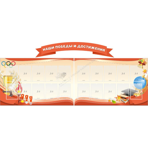 Размеры: 2.8х1.2 м. Количество деталей: 3 Материал: пластик ПВХ 3мм Рисунок: пленка с фотопечатью 720 dpi, ламинирующая пленка Разделы: Наши победы и достижения Количество карманов: 20 карманов А4 Крепление в комплекте
