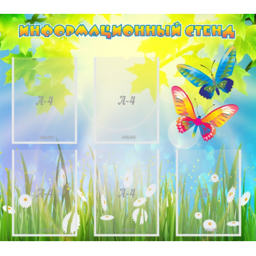 Размеры: 0.9х0.8 м. Количество деталей: 1 Материал: пластик ПВХ 3мм Рисунок: пленка с фотопечатью 720 dpi, ламинирующая пленка Разделы: Информационный Количество карманов: 5 кармана А4 Крепление в комплекте