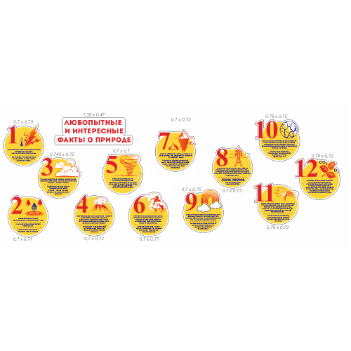 Размеры: 5,7х2,2 м. Количество деталей: 12 Материал: пластик ПВХ 3мм Рисунок: пленка с фотопечатью 720 dpi, ламинирующая пленка Разделы: Любопытные и интересные факты о природе Количество карманов: нет Крепление в комплекте