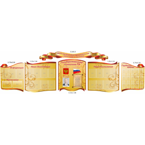 Размеры: 4,8х1,5 м. Количество деталей: 6 Материал: пластик ПВХ 3мм Рисунок: пленка с фотопечатью 720 dpi, ламинирующая пленка Разделы: Наименование учебного заведения; Информация и Расписание; Наши достижения (2 шт.); Гордость школы; Государственная символика Количество карманов: 21 карманов А4; 15 карманов А6 и 15 карманов 120х40 мм. Крепление в комплекте