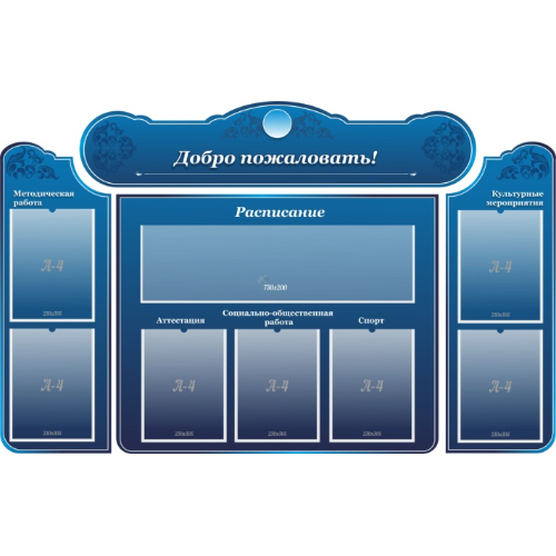 Размеры: 1.5х0,9 м. Количество деталей: 4 Материал: пластик ПВХ 3мм Рисунок: пленка с фотопечатью 720 dpi, ламинирующая пленка Разделы: Методическая работа; Расписание; Приветствие; Культурные мероприятия Количество карманов: 7 карманов А4, 1 карман 720х200 Крепление в комплекте