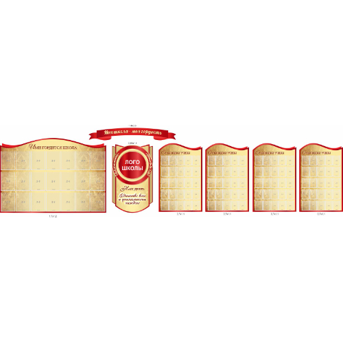 Размеры: 5,3х1,5 м. Количество деталей: 7 Материал: пластик ПВХ 3мм Рисунок: пленка с фотопечатью 720 dpi, ламинирующая пленка Разделы: Логотип школы; Моя школа – моя гордость; Ими гордится школа; Отличники учебы (4 шт.) Количество карманов: 21 карманов А4 и 100 карманов А6 Крепление в комплекте
