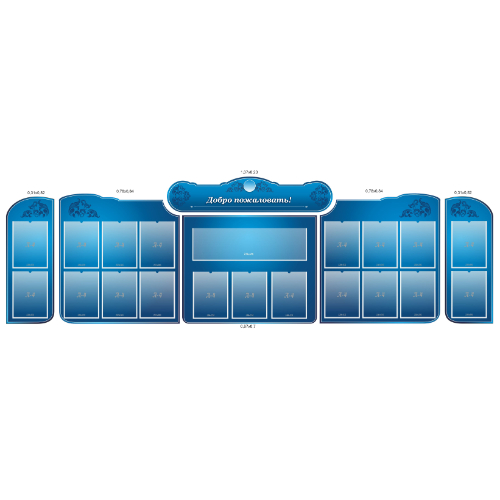 Размеры: 3,2х1 м. Количество деталей: 6 Материал: пластик ПВХ 3мм Рисунок: пленка с фотопечатью 720 dpi, ламинирующая пленка Разделы: Добро пожаловать Количество карманов: 19 карманов А4 и 1 карман 730х200 мм. Крепление в комплекте