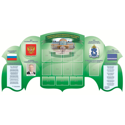 Размеры: 3,0х1,6 м. Количество деталей: 3 Материал: пластик ПВХ 3мм Рисунок: пленка с фотопечатью 720 dpi, ламинирующая пленка Разделы: Государственная символика; Добро пожаловать; Символика округа и области Количество карманов: 12 карманов А4 Крепление в комплекте