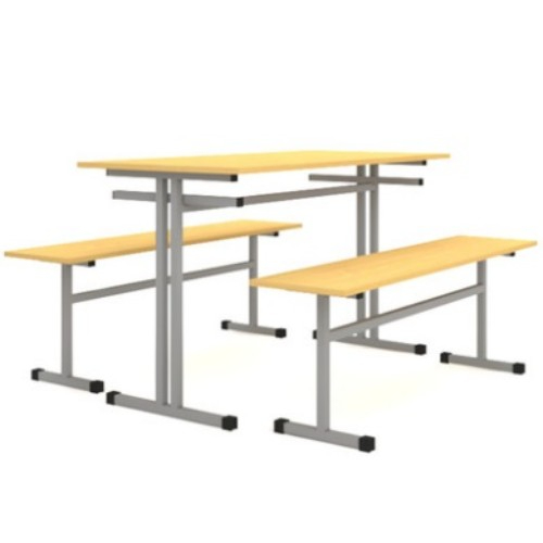 Стол обеденный 4-х местный, оборудованный двумя скамьями. Каркас изготовлен из металлической трубы квадратного сечения 25х25 мм, с полимерно-порошковой окраской в светло-серый цвет. Столешница стола выполена из пластика 16 мм., сидение скамьи из ЛДСП 16 мм. Размеры — 1200х600х700 мм.