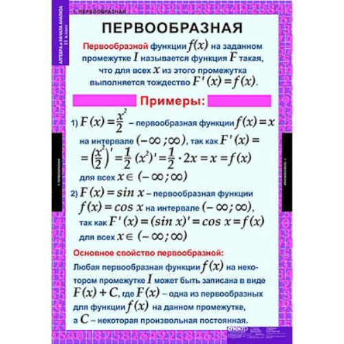 Учебный альбом из 15 листов, формат 68*98 см. Первообразная. Правила нахождения первообразных. Площадь криволинейной трапеции. Интеграл. Формула Ньютона-Лейбница. Вычисление объемов тел. Показательная функция. Показательные уравнения и неравенства. Логарифмическая функция. Свойства логарифмов. Логарифмические уравнения и неравенства. Понятие об обратной функции. Производная показательной функции. Производная логарифмической функции. Степенная функция и ее производная. Дифференциальные уравнения.