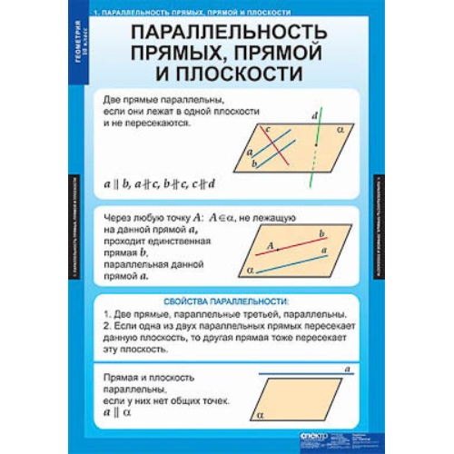 Учебный альбом из 14 листов, формат 68*98 см. Параллельность прямых, прямой и плоскости. Взаимное расположение прямых в пространстве. Параллельность плоскостей. Тетраэдр и параллепипед. Перпендикулярность прямой и плоскости. Перпендикуляр и наклонные. Угол между прямой и плоскостью. Двугранный угол. Перпендикулярность плоскостей. Понятие многогранника. Призма. Пирамида. Правильные многоугольники. Вектор в пространстве. Сложение и вычитание векторов в пространстве. Умножение вектора на число. Компланарные векторы. Площадь поверхности пирамиды и круглых тел.