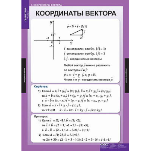 Учебный альбом из 13 листов, формат 68*98 см. Координаты вектора. Связь между координатами вектора и координатами его начала и конца. Уравнения окружности и прямой. Синус, косинус, тангенс угла. Основное тригонометрическое тождество. Формулы приведения. Соотношения между сторонами и углами треугольника. Теоремы синусов и косинусов. Скалярное произведение векторов. Правильные многоугольники. Построение правильных многоугольников. Длина окружности и площадь круга. Понятие движения. Параллельный перенос и поворот.