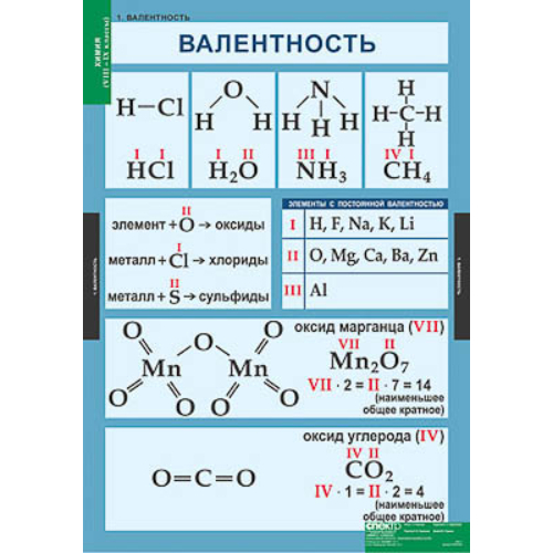 680х980 мм. Учебный альбом из 20 листов: 1. Валентность. 2. Относительная атомная и молекулярная массы 3. Строение атома, Изотопы. 4. Образование ковалентной и ионной химических связей. 5. Электронные слои атомов элементов малых периодов. 6. Окислительно-восстановительные реакции. 7. Типы кристаллических решеток. 8. Реакции обмена в водных растворах. 9. Важнейшие кислоты и их соли. 10. Классификация оксидов. 11. Классификация оснований. 12. Классификация кислот. 13. Генетическая связь важнейших классов неорганических веществ. 14. Окраска индикаторов в различных средах. 15. Электролитическая диссоциация. 16. Зависимость скорости реакции от различных факторов. 17. Типы химических реакций. 18. Обратимые реакции. 19. Воздух. Кислород. Горение. 20. Степень окисления.