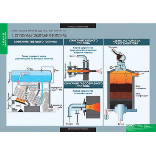 680х980 мм. Учебный альбом из 18 листов: 32. Способы сжигания топлива. 33. Производство серной кислоты (1). 34. Производство серной кислоты (2). 35. Производство аммиака. 36. Производство азотной кислоты. 37. Производство аммиачной селитры. 38. Силикатная промышленность. 39. Электролиз хлорида натрия. 40. Получение алюминия. 41. Химия доменного процесса. 42. Производство чугуна. 43. Конвертер с кислородным дутьем. 44. Выплавка стали в электропечи. 45. Выплавка стали в электронно-лучевой печи. 46. Обогащение руд флотацией. 47. Обжиг известняка. 48. Производства ацетилена. 49. Переработка нефти.
