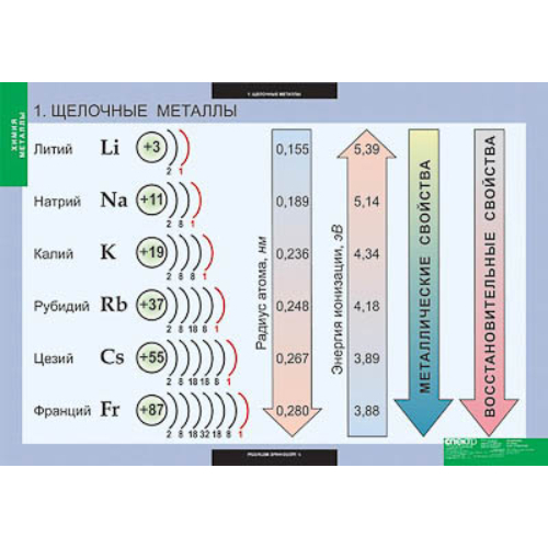 680х980 мм. Учебный альбом из 12 листов: 1. Щелочные металлы. 2. Химия щелочных металлов. 3. Элементы II А — группы. 4. Жесткость воды. 5. Алюминий. 6. Применение алюминия. 7. Железо. 8. Виды коррозии. 9. Методы защиты от коррозии. 10. Общие свойства металлов. 11. Переходные металлы. 12. Хром.