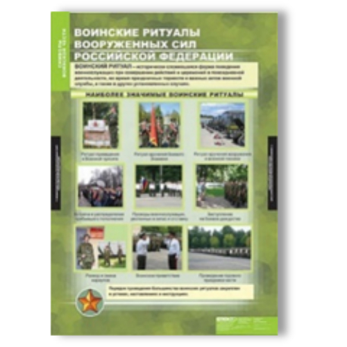 Учебный альбом из 5 листов, размер 68*98 см. Воинские ритуалы Вооруженных Сил Российской Федерации. Боевое знамя воинской части. Военная присяга. Военная форма одежды Вооруженных Сил Российской Федерации. Государственные награды Российской Федерации.
