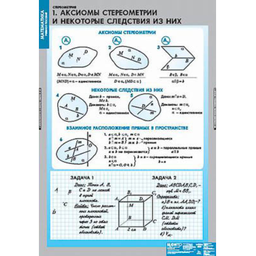 Учебный альбом из 9 листов. Формат 68 х 98 см. Аксиомы стереометрии и некоторые следствия из них. Параллельность в пространстве. Перпендикулярность в пространстве. Сечение параллелепипеда плоскостью. Сечение тетраэдра. Цилиндр и конус. Вписанные (описанные) многогранники. Векторы в пространстве. Метод координат в пространстве.