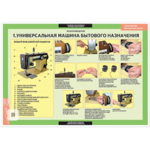 Учебный альбом из 6 листов, формат 68*98см. Универсальная швейная машина бытового назначения. Регулировка и уход за швейной машиной. Краеобметочная машина 51 класса ПМЗ. Утюг бытовой электрический. Электробезопасность. Техника безопасности при ручных и машинных работах.