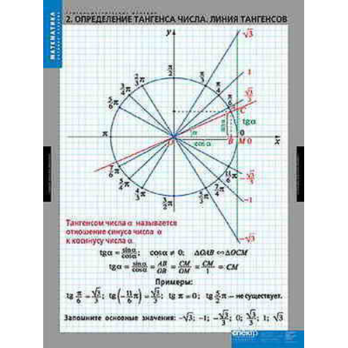 Учебный альбом из 8 листов, формат 68*98 см. Определение синуса и косинуса числа. Определение тангенса числа. Линия тангенсов. Определение котангенса числа. Линия котангенсов. Тригонометр. Функция y=arcsin x. Функция y=arccos x. Функция y=arctg x. Функция y=arcctg x.