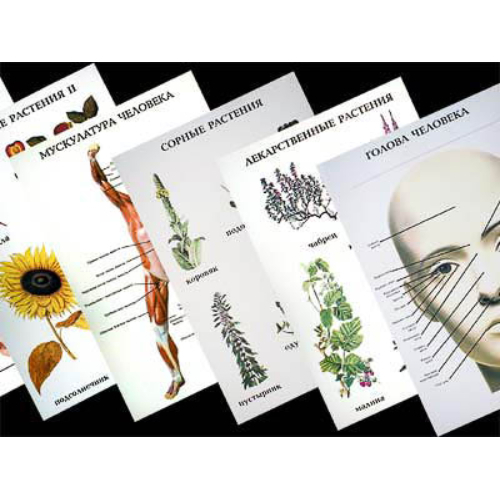46 таблиц формата А2. Комплектность: Ядовитые грибы. Съедобные грибы. Ядовитые растения. Лекарственные растения. Сорные растения. Культурные растения. Культурные растения II. Размножение растений. Защитные приспособления растений. Многообразие растений. Растения-паразиты и растения-хищники. Дикие звери. Дикие звери II. Дикие звери III. Домашние животные. Домашние животные II. Зимующие птицы. Перелетные птицы. Насекомые. Многообразие беспозвоночных. Многообразие позвоночных. Редкие и вымирающие животные. Животные океана. Пищевая цепь. Внешнее строение человека. Голова человека. Внутренние органы. Скелет. Мускулатура человека. Органы пищеварения. Кровеносная система. Нервная система. Тундра. Тайга. Лес. Луг. Степь. Пустыня. Лето. Осень. Зима. Весна. Солнечная система. Планета земля. Распорядок дня школьника. Способы ориентирования на местности.