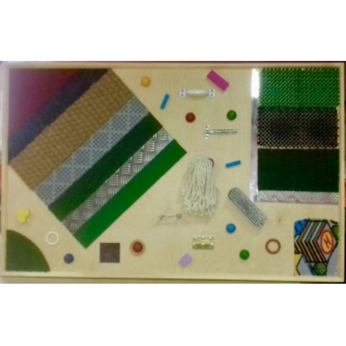 В панели размещены материалы с различными тактильными поверхностями, различные предметы, способствующие развитию тактильных ощущений, а так же – элементы игрушек. Панель развивает осязательные навыки, показана для детей с ослабленным зрением. Размер изделия: Высота: 750 мм. Ширина: 1200 мм. Глубина: 15 мм. Вес — 8,3 кг. Объем — 0,096 м3.