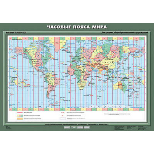 Масштаб 1:50000000, формат 100*70 см. На карте даются границы часовых поясов, окрашиваются цветом территории, на которых принято поясное время и территории, не пользующиеся поясным временем. Односторонняя печать, двустороннее ламинирование, лицевая сторона покрыта матовым ламинатом.