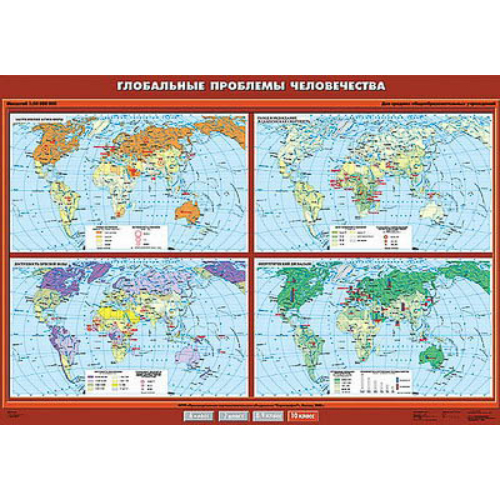Масштаб 1:50000000, формат 140*100 см. Карта состоит из четырех самостоятельных карт, характеризующих основные проблемы человечества: загрязнения атмосферы, голод, недоедание, младенческая смертность, отсутствие доступа к чистой питьевой воде, энергетический дисбаланс. Односторонняя печать, двустороннее ламинирование, лицевая сторона покрыта матовым ламинатом.
