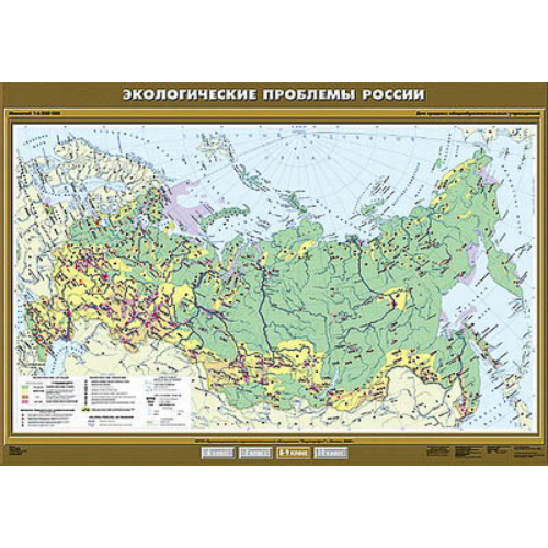 Масштаб 1:6000000, формат 140*100 см. Фоном на карте отражается экологическая ситуация: благоприятная, умеренно острая, острая, очень острая. Значками даются объекты повышенной экологической опасности, а также экологические проблемы: загрязнение атмосферы, почв, нарушение земель и истощение рек, показаны загрязненные участки рек. Односторонняя печать, двустороннее ламинирование, лицевая сторона покрыта матовым ламинатом.