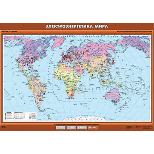Масштаб 1:25000000, формат 140*100 см. На карте даны тепловые электростанции, гидроэлектростанции, атомные электростанции мира. Размером знака выделены электростанции мощностью 5 мВт и более и группы электростанций. Фоном дано производство электроэнергии на душу населения по странам.Односторонняя печать, двустороннее ламинирование, лицевая сторона покрыта матовым ламинатом.
