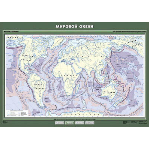 Масштаб 1:25000000, формат 140х100 см. На карте даются элементы дна мирового океана: хребты, разломы и трещины, границы материковой отмели, глубоководные желоба, материковая отмель, подводные равнины, хребты и возвышенности, котловины. Односторонняя печать, двустороннее ламинирование, лицевая сторона покрыта матовым ламинатом.