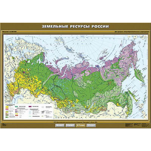 Масштаб 1:6000000, формат 140*100 см. На карте цветом показаны сельскохозяйственные угодья: обрабатываемые угодья, природные кормовые угодья, земли под болотами, слабоиспользуемые земли, а также зоны концентрации мелкоконтурных угодий различных видов. Зеленым кантом обозначены лесозащитные полосы, штриховкой – нарушенные земли. Односторонняя печать, двустороннее ламинирование, лицевая сторона покрыта матовым ламинатом.